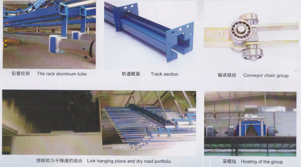 本機與常規晾革懸掛輸送機的結構形式基本相同,各零部件在原有的基礎上都進行的增強,以滿足用戶的生產工藝。 掛架配用直徑40鋁合金管,表面光滑,材質輕,強度好,對皮張不易污染,不易產生折痕。 本機也可與干燥道組合使用,皮張可通過干燥道達到干燥、去味等效果。